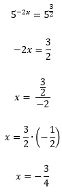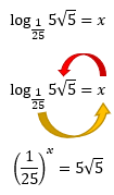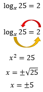 Temos dois resultados possíveis, x1 = +5 e x2 = -5. Contudo, a base x, deve ser um valor maior que zero e diferente de um (0 < x ≠ 1). Isso significa que devemos descartar o resultado x2, porque ele é um valor negativo, e assim nossa resposta é unicamente: