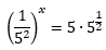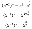 Chegamos a nossa expressão exponencial, e a ideia agora é buscar o auxílio das propriedades da potenciação que vimos na tabela, para que possamos chegar a uma igualdade de potências de mesma base. Reparem que no lado esquerdo da igualdade temos uma fração, onde o denominador é 25. 25 é uma potência de 5, porque 5² = 25, então podemos substituir esse termo na equação. Do outro lado, temos uma raiz quadrada de 5. Isso parece um problema não é? Mas se vocês repararem na nossa tabela, temos uma propriedade que nos permite transformar um radical em uma potência com expoente fracionário, a propriedade 8. Vamos aplica-la ao lado direito da equação: