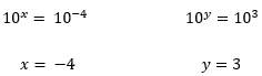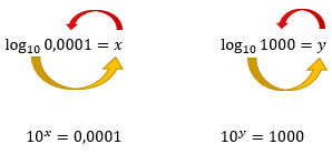 Se observarmos agora, no lado direito de ambas as equações, nós temos potências de base 10. Andando 4 casas para a direita, no primeiro caso, sabemos que 0,0001 = 10-4, ao mesmo tempo que, se andarmos 3 casas para a esquerda, no segundo caso, podemos dizer que 1000 = 10³, e assim, temos: