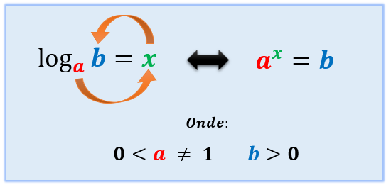 Da maneira como o logaritmo é definido neste quadro, nós podemos dizer que o termo a é a sua base, o termo b o seu logaritmando e x o logaritmo ou o resultado da operação. Ainda, temos que lembrar de algumas restrições que os valores de a e b possuem. A base a deve ser sempre um valor maior que zero e diferente de 1, enquanto que o logaritmando b deve ser necessariamente um valor maior que zero. Assim, através do processo de logaritmação, nós podemos dizer que a base a elevada ao expoente x resulta no valor de b, o logaritmando.