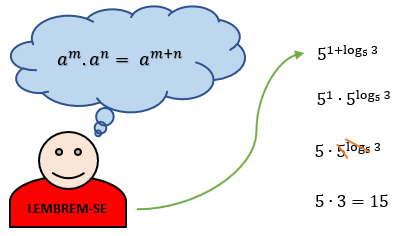 Novamente encontramos uma potência, e no seu expoente temos a presença de um logaritmo. É claro que a única consequência da definição que se encaixa ao caso é a 3ª que estudamos, mas reparem que dessa vez encontramos também uma soma no expoente da potência. Para resolver esse impasse, primeiramente faremos o uso de mais uma propriedade da potenciação, olhem só: