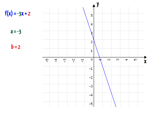 Vejam que essa função possui valores diferentes para os coeficientes a e b, e também uma forma gráfica diferente do exemplo anterior. Então, se vocês ainda não mataram a charada, entendam o seguinte: os coeficientes a e b são quem determinam, ou quem definem a função do primeiro grau! Você aí, com certeza tem características que te definem, ou que te tornam diferente das outras pessoas. O mesmo acontece na função afim: cada função possui uma forma gráfica diferente, inteiramente determinada por seus coeficientes a e b.