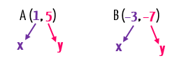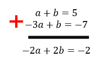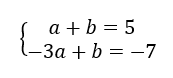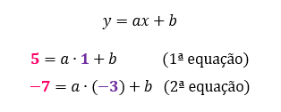 Então, sem mais delongas, vamos substituir, respectivamente, os valores de x e de y da fórmula característica da função do 1º grau, por 1 e 5, e também por –3 e –7, formando duas equações cujas incógnitas serão a e b.