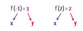 De acordo com o que nós estudamos acima, se é dito que f(–1) = 3, e que f(2) = 2, significa que 3 é o valor da função ou o valor de y quando x é igual a –1, da mesma forma que 2 é o valor da função ou o valor de y quando x também é igual a 2.