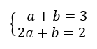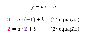 Esses dados nos permitem substituir, respectivamente, os valores de x e de y da fórmula característica da função do 1º grau, por –1 e 3, e também por 2 e 2, formando duas equações cujas incógnitas serão a e b.