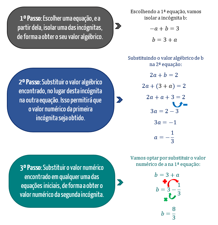 Ora, e não é que houve a formação de um sistema mesmo!? Pois bem, existem dois métodos muito simples que possibilitam a resolução de sistemas como esse: o método da substituição, e o método da adição. Nós vamos utilizar este exemplo para compreendermos a resolução de um sistema através do método da substituição: