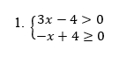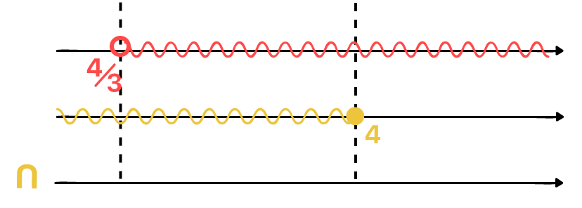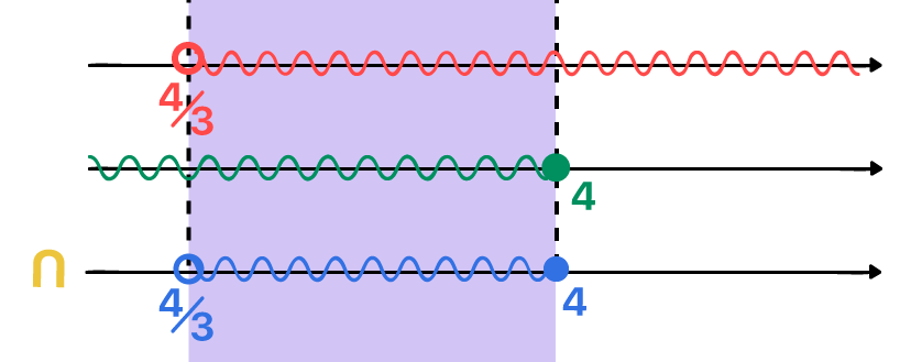 Desta forma, podemos ver na imagem acima, que os únicos valores comuns a ambas as soluções são aqueles que começam em 4/3, sem inclui-lo, já que ele não faz parte da primeira solução (intervalo aberto), e terminam em 4, o incluindo, já que este sim faz parte de ambas as soluções (intervalo fechado). Em forma de conjunto, podemos expressar a solução para as inequações simultâneas que acabamos de resolver da seguinte maneira: