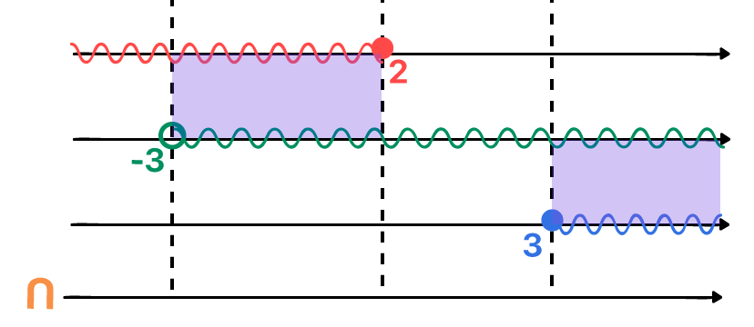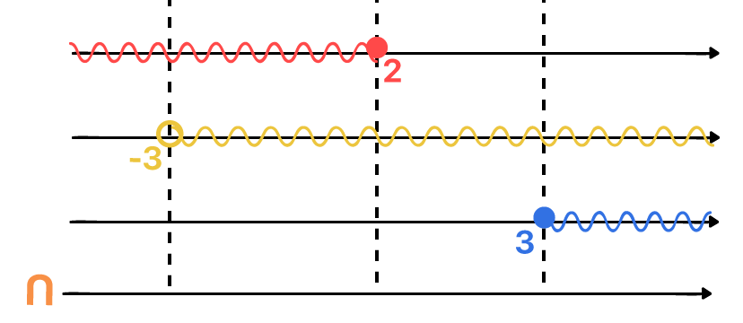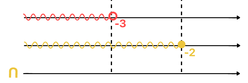 A melhor forma de realizar a intersecção entre duas soluções, é desenhando a representação geométrica de cada uma delas, uma embaixo da outra, e logo abaixo, outra reta real que representará a solução geral para o caso. Traçar pontilhados verticais na região de cada bolinha que representa os valores de referência dos intervalos formados, é algo que pode ajudar na visualização do resultado.