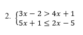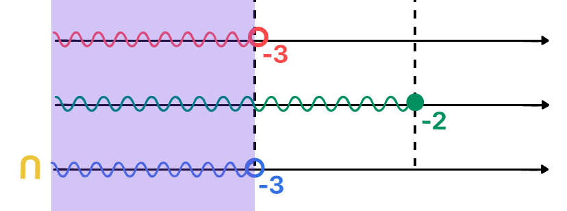 Para a primeira inequação, 3x – 2 > 4x + 1, qualquer valor menor que –3 poderá substituir o lugar de x e satisfazer a desigualdade. Já para a segunda inequação, 5x + 1 ≤ 2x – 5, qualquer valor menor ou igual a –2 poderá substituir o lugar de x e satisfazer a desigualdade. Mas através da imagem acima, podemos perceber que são comuns a ambas as soluções apenas os valores reais menores do que –3, sem incluí-lo, afinal, –3 não faz parte da primeira solução, e só participam do conjunto intersecção, os valores reais que pertencem a ambas as soluções, não é mesmo?