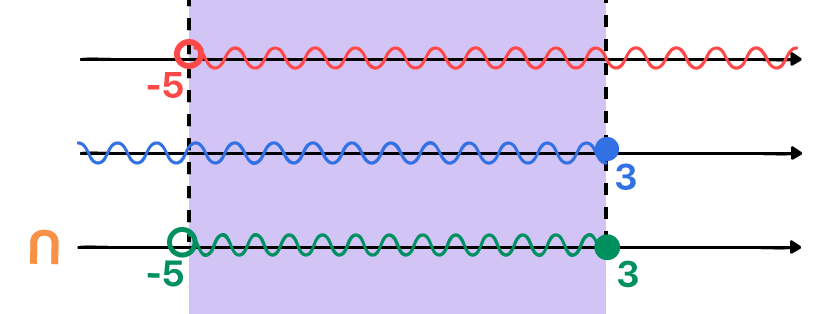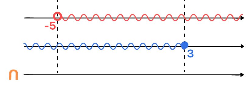 Quem já está craque na intersecção, deve ter percebido, antes mesmo de realizarmos a representação da imagem acima, que os únicos valores reais que podem substituir o lugar do x de ambas as inequações, de forma a satisfazer as duas desigualdades, são aqueles que se situam entre –5, sem incluí-lo, e 3, o incluindo na solução.