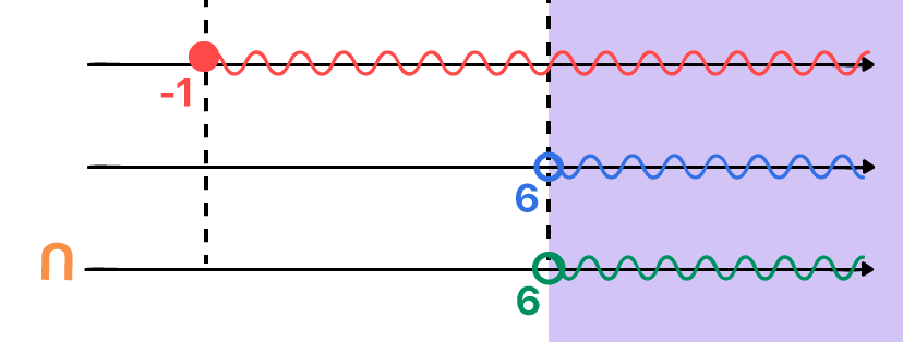 Como vemos na imagem acima, os únicos valores reais que podem substituir o lugar de x em ambas as inequações e satisfazer as duas desigualdades simultaneamente, são aqueles maiores do que 6, o excluindo, já que 6 não faz parte da segunda solução.