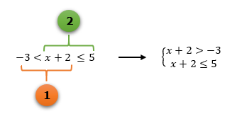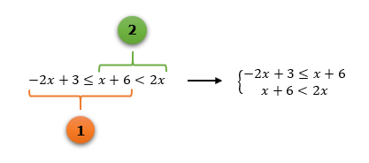 Mas que coisa maluca: ao invés de um sistema, surgiram agora dois sinais de desigualdade em uma mesma inequação! Novamente, não há motivos para se assustar: sempre que as inequações simultâneas se apresentarem dessa forma, vocês deverão separá-las em duas, e assim poderão montar um sistema igualzinho ao dos casos anteriores, o que tornará possível a utilização do mesmo método de resolução que temos aplicado até então.