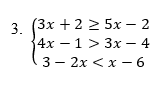 Olhem só que interessante: para a primeira inequação, 3x + 2 ≥ 5x – 2, qualquer valor menor ou igual a 2 poderá substituir o lugar de x e satisfazer a desigualdade. Já para a segunda inequação, 4x – 1 ≥ 3x – 4, qualquer valor maior que –3 poderá substituir o lugar de x e satisfazer a desigualdade. Mas para a terceira e última inequação, 3 – 2x < x – 6, apenas os valores maiores que 3 poderão substituir o lugar de x e satisfazer a desigualdade. Será que em meio a tantas soluções, haverá algum trecho de valores reais que seja comum a todas elas? É isso que nós veremos agora.