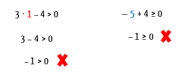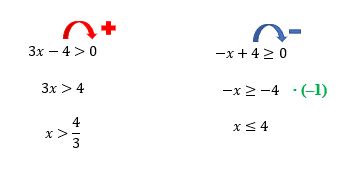 Vejam, a solução da primeira inequação é formada por todos os valores de x maiores do que 4/3, que na forma decimal, é a dízima periódica 1,333333… Isso significa, que se qualquer valor maior que 4/3 substituir o lugar de x na inequação 3x – 4 > 0, ela resultará em um valor maior que zero, exatamente como deve ser. O mesmo acontece com a segunda inequação: sua solução é formada por todos os valores de x menores ou iguais a 4. Isso significa, que se qualquer valor menor ou igual a 4 substituir o lugar de x na inequação –x + 4 ≥ 0, ela resultará em um valor maior ou igual a zero, como foi determinado.