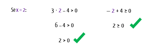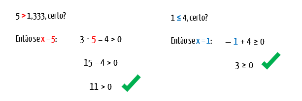 E agora, para provar que não estou mentindo, vamos fazer um último teste: substituiremos a incógnita x de ambas as inequações que avaliamos por um valor que se situe entre 4/3 e 4. Se a nossa conclusão estiver certa, as duas inequações serão satisfeitas.
