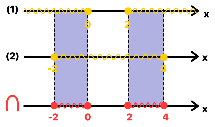 Vejam que desenhamos acima três retas reais, que representam, respectivamente, as soluções da inequação 1, da inequação 2, e por fim, a solução da inequação simultânea como um todo. Reparem que os únicos valores de x que satisfazem ambas as inequações, e portanto, pertencem ao conjunto intersecção, são aqueles que iniciam em –2 e terminam em 0, e também aqueles que iniciam em 2 e terminam em 4, incluindo os próprios –2, 0, 2 e 4, já que todos eles fazem parte de ambas as soluções (bolinha fechada).