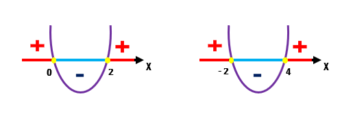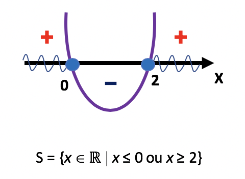 É possível ver na imagem acima, que a solução da primeira inequação será formada pelos valores de x que tornam a função positiva ou igual a zero (sinal de desigualdade ≥). Assim, nos interessam apenas os valores de x menores do que zero e maiores do que 2, afinal, nessas regiões o gráfico se encontra acima do eixo x. Também não podemos deixar de reparar, que as duas raízes da função entrarão na solução, até porque, exatamente nesses pontos o gráfico corta o eixo x, e portanto, torna a função igual a zero.