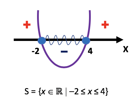 Já em relação a solução da segunda inequação, temos um caso um pouquinho diferente. Através do sinal de desigualdade ≤, fica determinado que apenas os valores de x que tornam a função negativa ou igual a zero satisfazem a inequação. Assim, nos interessam apenas os valores de x que se situam entre –2 e 4, afinal, somente nessa região o gráfico se encontra abaixo do eixo x. Contudo, não podemos negar que as duas raízes da função também farão parte da solução, porque exatamente nesses pontos o gráfico corta o eixo x, e torna a função igual a zero.