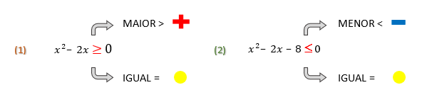 Conhecendo o esboço do gráfico das duas funções, é chegada a hora de voltarmos a dar uma olhada lá nas inequações iniciais que motivaram todo esse passo a passo. O sinal de desigualdade de cada uma delas irá nos informar, se os valores de x que procuramos são aqueles que tornam a função maior do que zero ou positiva, menor do que zero ou negativa, ou mesmo exatamente igual a zero!