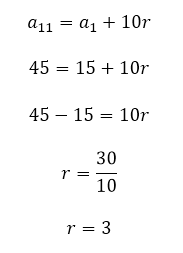 Novamente, temos o valor do primeiro e do último termo da sequência que deverá ser formada, respectivamente, 15 e 45. E se entre eles devem ser inseridos 9 meios aritméticos, isso significa que a progressão aritmética terá um total de 11 termos, n = 11. Então é claro que o último termo da PA é, na verdade, o seu 11º termo, e que a11 é igual a a1 acrescido de 10 razões.