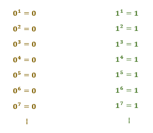 Podemos elevar o número 0 ou o número 1 a qualquer valor: o resultado será sempre definido, ou o mesmo. Mas a ideia, em uma função exponencial, é obter como imagem uma série de valores que crescem ou decrescem infinitamente de forma exponencial, e não apenas valores constantes. Ou seja, a forma como a função exponencial é definida, e o seu objetivo final, não são compatíveis com o comportamento das potências de base 0 e 1. Por isso, a existência da função se restringe aos possíveis valores de a que nós vimos anteriormente.