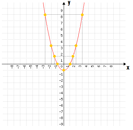 Já ficou bem mais interessante, não é mesmo? Pois bem, na medida em que escolhermos mais uma série de valores de x, e calcularmos os seus respectivos valores em y, teremos outros infinitos pontos nesta curva, que darão ainda mais forma ao gráfico da função f (x) = x2 – 1. Mas preencher todos os pontos desta curva seria impossível, pelo menos em pouco tempo. Por isso a ideia é ligar todos os pontos que já encontramos, formando a curva apresentada na imagem abaixo: