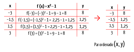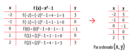 O primeiro passo, como vimos no texto, é adotar uma série de valores de x que serão as coordenadas do eixo das abscissas. Sendo assim, adotaremos aqui os valores – 2, – 1, 0, 1 e 2. Agora resta-nos substituir todos eles na função f (x) dada no enunciado. Os resultados dessas operações, serão as coordenadas em y, ou do eixo das ordenadas, da função f (x) = x2 – 1. Vamos lá então:
