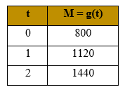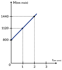 Vamos fazer o gráfico representativo do montante desta operação financeira citada acima, M= 320t + 800. Para isso, vamos montar uma tabelinha com alguns valores de tempo (t) e calcular o montante (M) correspondente.