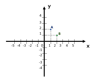 A forma como descrevemos os pontos ou coordenadas do plano cartesiano é chamada de par ordenado, porque a ordem em que os elementos são dispostos importa, diferente do que acontece quando os elementos de um conjunto são representados, por exemplo. Um certo conjunto A = {1, 2} possui os mesmos elementos que um certo conjunto B = {2, 1}, que são os valores 1 e 2, ou seja, aqui, a ordem da representação não mudou nada. Mas quando se fala em coordenadas, dado o par ordenado A(1, 2), tem-se que a coordenada de A em x é de valor 1 e que a coordenada de A em y é de valor 2. Do contrário, ou seja, dado o par ordenado B(2, 1), tem-se que a coordenada de B em x é de valor 2 e que a coordenada de B y é de valor 1. Vamos representar esses dois pares ordenados no plano cartesiano abaixo, para vocês verem como se confundir com a ordem dos valores pode gerar pontos em localizações bem diferentes, e portanto, causar um erro grave!