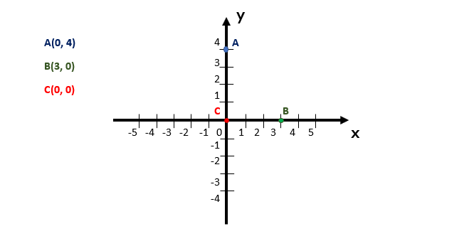 Já quando um ponto qualquer se localiza exatamente sobre o eixo das ordenadas, ele certamente terá a configuração (0, y), o que significa que a coordenada y possuirá um certo valor real, enquanto a coordenada x valerá zero, com toda a certeza. O ponto A(0, 4), representado geometricamente no plano cartesiano acima, nos mostra um exemplo de uma situação como essa.