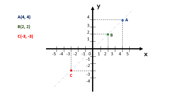 Agora vamos ver uma situação diferente. Vocês conseguiram notar algo em comum entre os pontos A, B, e C do plano cartesiano acima? Então olhem com bastante atenção: a verdade, é que todos eles possuem os valores das coordenadas x e y iguais! Isso sempre acontecerá quando os pontos forem localizados exatamente sobre a bissetriz dos quadrantes ímpares, que nós quase não conseguimos enxergar no plano acima. Assim, um ponto qualquer que se localiza exatamente sobre a bissetriz dos quadrantes ímpares, sempre terá a configuração (k, k), em que abscissa e ordenada possuem o mesmo valor.