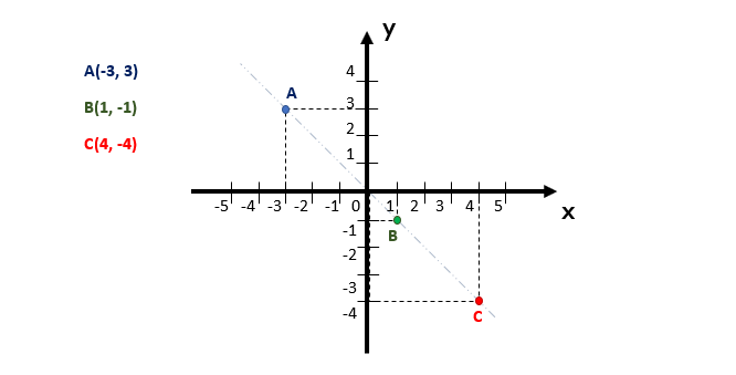 E se tratando da bissetriz dos quadrantes pares, o que será que acontece? Bom, se um ponto se localizar exatamente sobre ela, então as suas coordenadas terão o mesmo valor em módulo, mas sinais opostos, como são as coordenadas dos pontos A, B e C representados geometricamente no plano cartesiano acima. Por isso, podemos dizer que um ponto qualquer que se localiza exatamente sobre a bissetriz dos quadrantes pares, sempre terá a configuração (k, –k) ou (-k, k).
