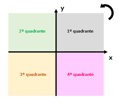 Pessoal, isso é bastante simples! Vejam que o 1º quadrante ou quadrante 1, está localizado onde todos os valores dos eixos x e y são positivos. Memorizem a posição desse quadrante! Aí, é só seguir pelas regiões no sentido anti-horário para encontrar o 2º, o 3º e o 4º quadrante! Viram como é fácil? Mas vocês também podem se basear nos valores numéricos dos eixos para se localizar. Em cada quadrante, os valores de x e de y podem ser positivos (maiores do que zero), ou negativos (menores do que zero) como mostram as definições abaixo: