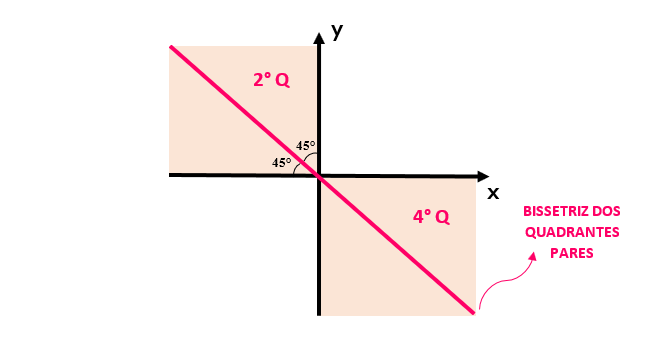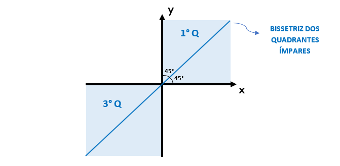 Além disso, é imprescindível conhecermos o seguinte detalhe: o número dado a cada um dos quadrantes, os divide em dois grupos distintos: os números 1 e 3 são números ímpares, por isso o 1º e o 3º quadrante são conhecidos como quadrantes ímpares. O mesmo é válido para os quadrantes restantes: como 2 e 4 são números pares, temos que o 2º e o 4º quadrante são chamados de quadrantes pares. Assim se uma certa reta cortar os quadrantes ímpares bem ao meio, dividindo pela metade o ângulo de 90º formado pelo cruzamento dos eixos x e y, diz-se que essa reta é denominada bissetriz dos quadrantes ímpares. É claro, que se a mesma reta cortar ao meio os quadrantes pares, ela será conhecida como bissetriz dos quadrantes pares. Observem as figuras para que fique bem claro: