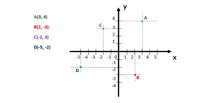 Um tanto confuso, não é mesmo? Por isso, nada melhor do que realizar a representação geométrica de alguns pontos no plano cartesiano para esclarecer essa ideia. Assim, dadas as coordenadas abaixo, o “segredo” é encontrar nos eixos x e y, respectivamente, o valor da coordenada x, depois o valor da coordenada y, e em seguida, ligar esses valores através de retas tracejadas. Na medida em que as retas se cruzarem, ou que houver a intersecção entre as retas, teremos ali a localização dos pontos especificados.