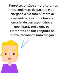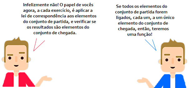 Ficaram ligados no que eu disse aí em cima? Pois é, nem nos conjuntos tudo é perfeito! Nem sempre os conjuntos de partida e de chegada vão ter o mesmo número de elementos, e nem sempre vamos conseguir efetuar ligações entre todos os elementos. O fato é que não importa se restarem elementos sem ligação no conjunto de chegada, só não podem restar elementos no conjunto de partida. E ainda, para que uma função exista, cada elemento do conjunto de partida deve ter apenas um único elemento correspondente no conjunto de chegada, ou seja, apenas uma única setinha deve sair de cada elemento do conjunto de partida rumo a um dos elementos do conjunto de chegada.