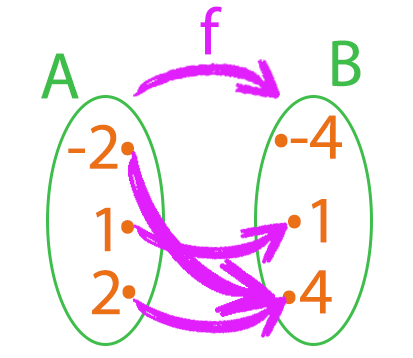 Agora, para determinarmos se f é de fato uma função de A em B, precisamos aplicar os valores dos elementos do conjunto A, na nossa lei de correspondência, y = x2. Como sabemos que os valores de x pertencem ao conjunto A, e que os valores de y pertencem ao conjunto B, nós vamos substituir o valor de x na expressão por cada um dos elementos do conjunto A. De posse dos resultados, nós verificaremos se o conjunto B possui esses elementos, e faremos as ligações no diagrama.