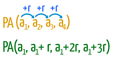 A notação especial de uma PA de 4 termos também segue a lógica que acabamos de aprender. Só que agora nosso ponto de partida será o primeiro termo da sequência, o a1. Assim, manteremos esse termo como está, e definiremos os demais com base nele, e em quantos saltos a razão dá para a direita na sequência, como mostra a figura abaixo:
