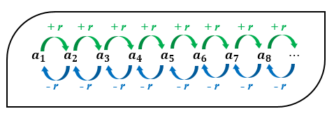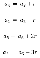 Onde a1, é o primeiro termo, a2 é o segundo e a3 é o terceiro termo da sequência. Como se trata de uma PA, nós sabemos que uma vez que conheçamos o valor de um de seus termos, e sua razão r, poderemos chegar ao valor de qualquer outro termo, da forma que aparece na figura abaixo: