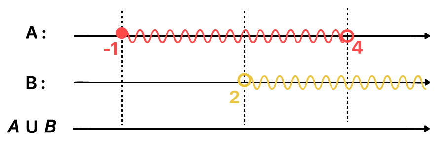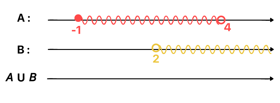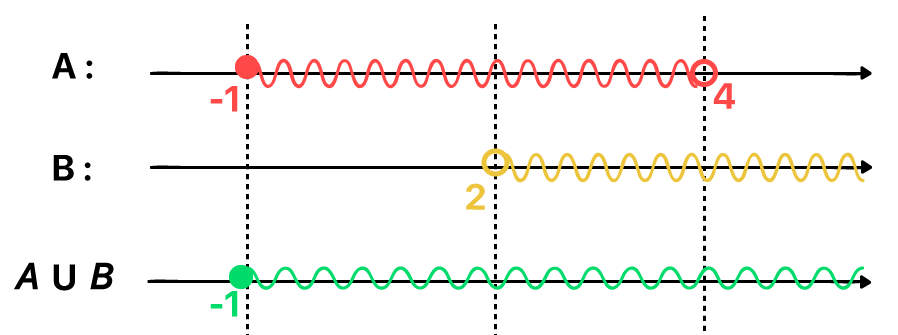 Segundo essa definição, qualquer valor numérico que pertença ou a A ou a B, ou aos dois intervalos, fará parte da união entre estes dois intervalos. Voltando a imagem acima, nós podemos perceber que os valores de A iniciam em –1, incluindo o próprio –1 e vão até o 4 sem incluí-lo. Por sua vez, o intervalo B inicia em 2, sem incluí-lo, e segue rumo ao mais infinito. Aí é muito importante repararmos, que apesar do 4 não fazer parte de A, ele faz parte do intervalo B, da mesma forma que embora o valor 2 não faça parte de B, ele faz parte do intervalo A. Como na operação da união, basta que o valor numérico se localize em um dos intervalos para fazer parte da solução, o conjunto A ⋃ B será formado por todos os valores reais maiores ou iguais a –1.