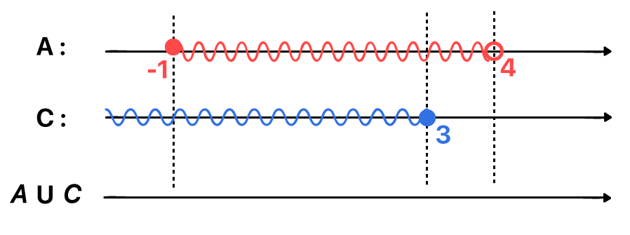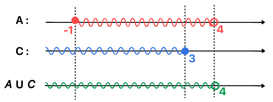 Novamente, por estarmos tratando de uma união, sabemos que qualquer valor que pertença ao intervalo A, ao intervalo C ou a ambos os intervalos, fará parte da solução. O intervalo A inicia em –1, incluindo o próprio –1, e termina 4, sem incluí-lo. Já o intervalo C vem lá de menos infinito e termina em 3, o incluindo. Assim, é fato que todos os valores que vem de menos infinito, incluindo –1 e 3 que pertencem a ambos os intervalos, fazem parte da solução. Além disso, valores que iniciam depois de 3 e vão até 4, sem incluí-lo, também fazem parte da solução, afinal pertencem a pelo menos um dos intervalos, o A.