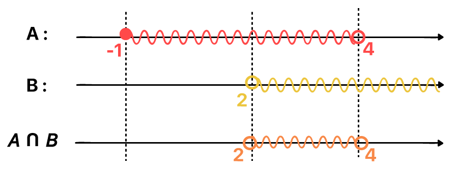 Através da imagem acima, é possível perceber que os valores de referência dos intervalos envolvidos na operação são –1, 2 e 4. Vamos traçar um pontilhado vertical na região de cada bolinha que representa esses valores, pois isso facilitará a resolução da operação logo mais.