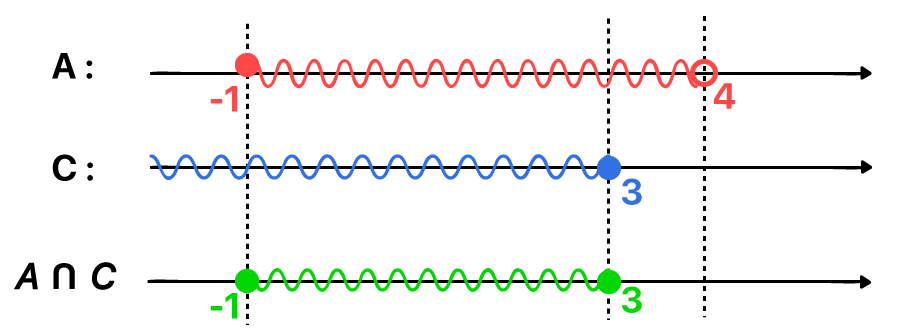 Conhecendo o conceito de intersecção e observando a imagem acima, nós podemos concluir que os únicos valores que pertencem a A e a C simultaneamente, são aqueles que começam em –1 e terminam em 3, incluindo os próprios –1 e 3, já que ambos também pertencem aos dois intervalos.