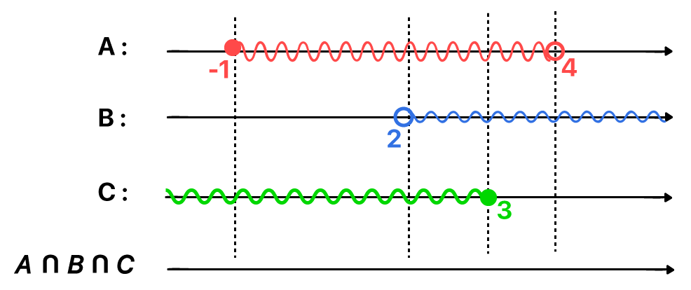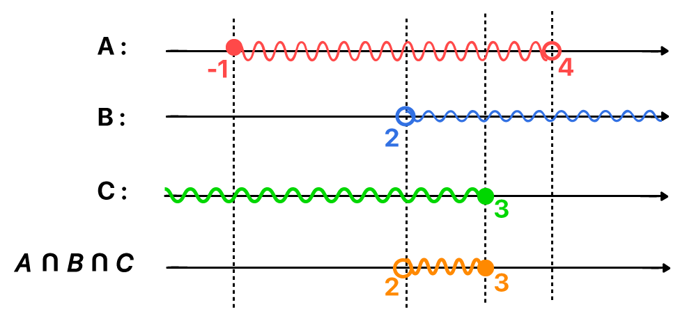 Observem que o único trecho de valores que pertence aos três conjuntos simultaneamente é aquele que inicia no valor 2, sem incluí-lo, afinal este valor não faz parte do intervalo B, e vai até o número 3, incluindo-o, já que 3 pertence aos três intervalos simultaneamente.