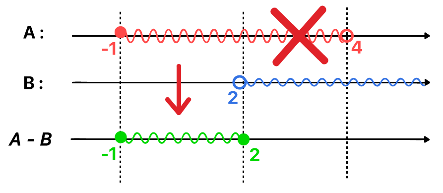 Segundo esta definição, para obtermos a diferença entre os intervalos A e B, basta descontarmos ou removermos do intervalo A os valores que também pertencem ao intervalo B. Observando a imagem acima, nós podemos perceber que os únicos valores de A que também pertencem ao intervalo B são aqueles que se situam entre 2 e 4, sem incluí-los, afinal o 4 não pertence ao intervalo A, enquanto o 2 não pertence ao intervalo B. Por isso, vamos remover esses valores, e a região do intervalo A que restar será o resultado da operação.