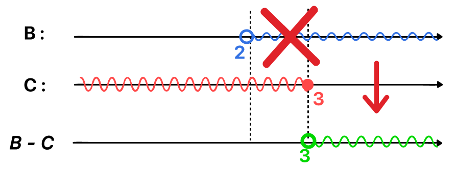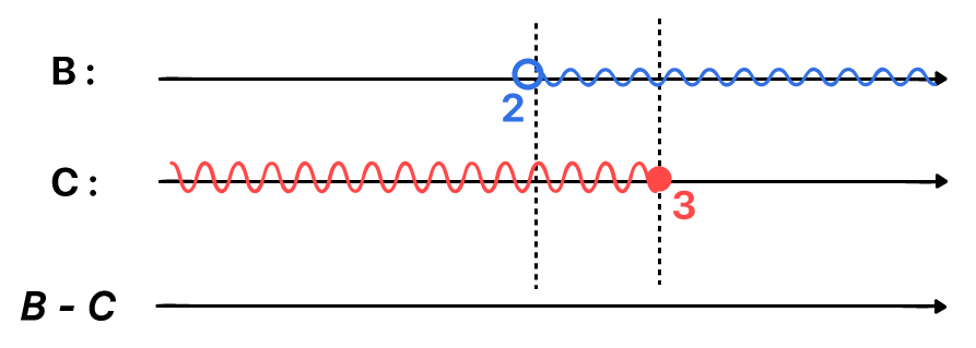 Neste caso, como deveremos calcular a diferença entre os intervalos B e C, nós precisaremos descontar do intervalo B os valores que também pertencem ao intervalo C. Visto isso, podemos observar na imagem acima, que os únicos valores de B que também pertencem a C são aqueles que começam depois de 2, já que 2 não pertence a B, e vão até 3, incluindo o próprio 3, uma vez que ele pertence a ambos os intervalos. Excluindo ou removendo esses valores em comum do conjunto B, nós concluímos que pertencerão a solução todos os valores reais superiores a 3, sem incluí-lo.