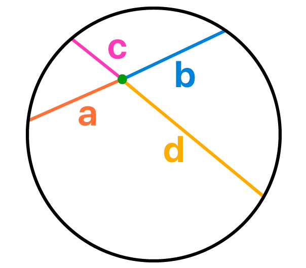 Vejam na imagem acima, que temos duas cordas se interceptando, ou se cruzando em um único ponto interno a circunferência. No fim das contas, esse ponto acaba dividindo cada uma das cordas em duas partes, cujos comprimentos podem ser representados pelas letras a, b, c, e d, como mostra a imagem abaixo: