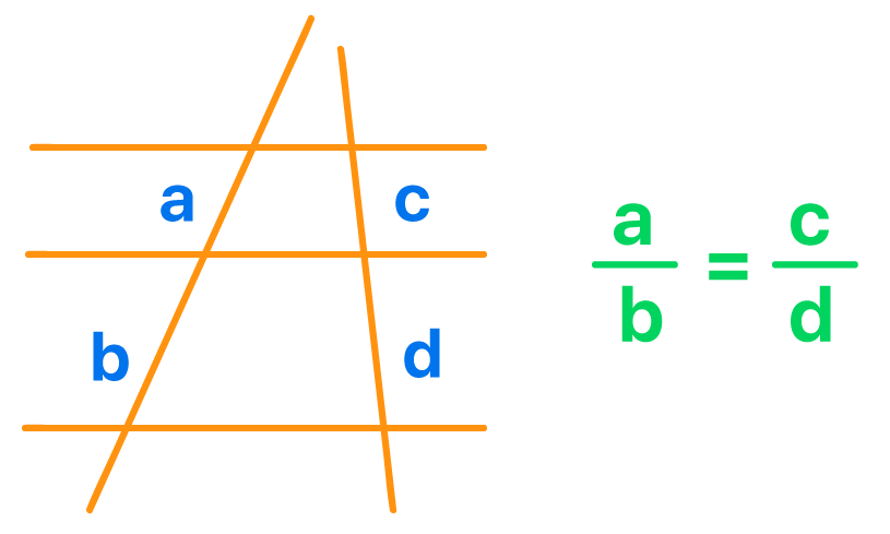 Segundo o Teorema de Tales, quando duas retas transversais interceptam um feixe de retas paralelas, diz-se que razão entre as medidas dos segmentos a e b de uma das transversais, é exatamente igual a razão entre as medidas dos segmentos c e d correspondentes na outra transversal.