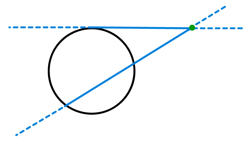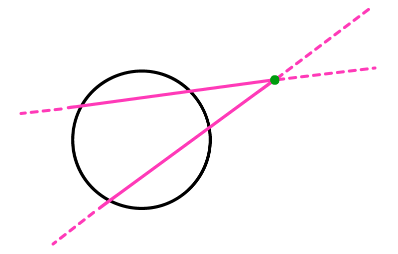 Se olhássemos a imagem acima rapidamente, poderíamos até pensar que não há diferença alguma com relação ao caso anterior. Entretanto, quem conhece o conceito de reta tangente, provavelmente percebeu que uma das retas que foram apresentadas não corta a circunferência em momento algum, mas apenas encosta nela em um único ponto. É por isso que nesse caso, diz-se que uma reta tangente e uma reta secante estão se intersectando em ponto externo a circunferência.