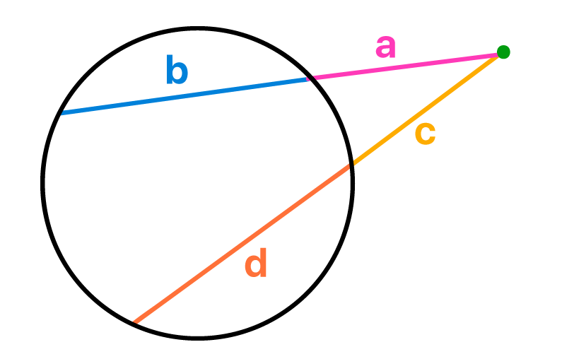 Mais uma vez, apenas alguns trechos das retas secante e tangente apresentadas vão nos interessar. A primeira delas possui um segmento interno a circunferência, cujo comprimento é dado por c, e também um segmento externo, cujo comprimento vale b. Enquanto isso, a segunda reta tem apenas um segmento externo a circunferência, cujo comprimento é igual a a. Essas observações nos permitem entender direitinho a seguinte definição: